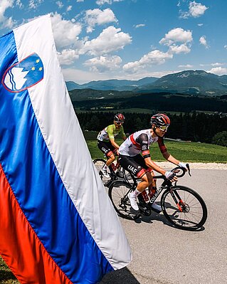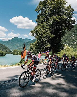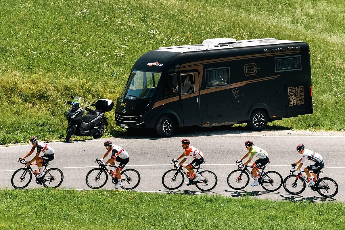 Titel erfolgreich verteidigt: Wie im Vorjahr hat Radrennfahrer Tadej Pogačar mit der Slowenien-Rundfahrt sein Heimspiel klar gewonnen. Sie war gleichzeitig ein willkommener Fitnesstest für die anstehende Tour de France. Immer dabei im Fahrerlager: der markant folierte Carthago c-compactline des Weltklasse-Radfahrers.