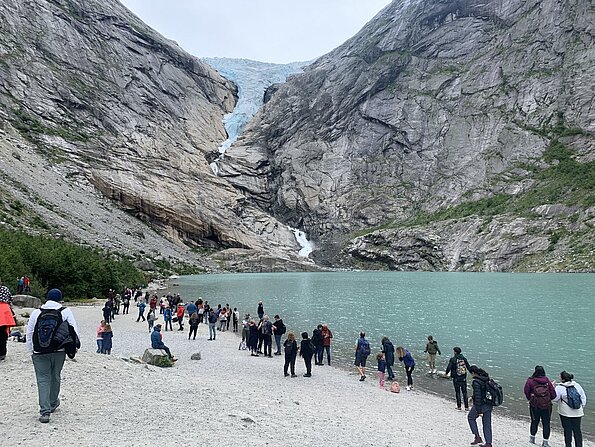 Färden gick vidare in till Briksdalsbreen. Även det ett populärt utflyktsmål för bl a kryssningsturister och vi var många som gick de 3 km upp till glaciären.