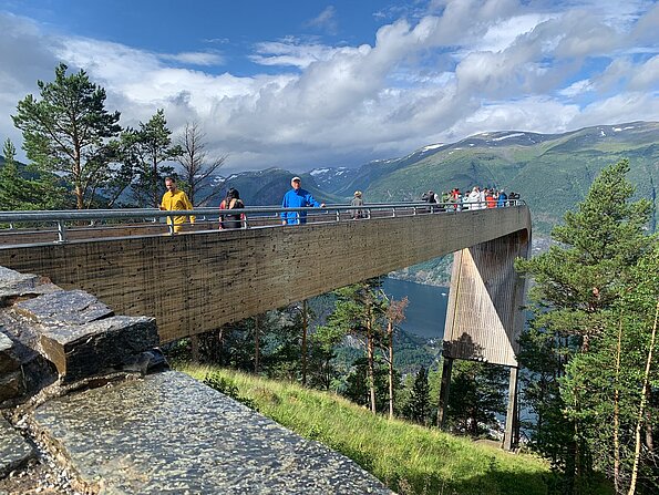 Wanting to get back on the 'mountain', we took the road over the Aurdalsfjellet above the 24 km long Lerdal tunnel. As everywhere else in Norway, this road also offered fantastic, wide-ranging views. Including from the Stegastein viewing platform over the Aurlandsfjord. The weather was mixed with rain and sun.