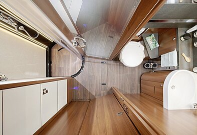 A unique 4-room concept with an abundance of space, refinement and creature comforts in which to relax and unwind. At the front are electrically lowering lengthways single beds that provide a spacious, continuous sleeping area to ensure a good night’s sleep thanks to the ‘Carawinx’ sleeping system. Medically recommended, point elastic under springing and high-quality 7 zone foam mattress with breathable climate quilting.