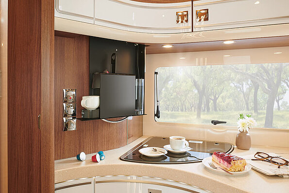 Qu'est-ce que ce sera - un petit déjeuner, un grand menu ? La cuisine Carthago ouvre l'appétit et donne envie de cuisiner. C'est toujours étonnant : la cuisine est spacieuse et pleine de détails raffinés qui font la différence. Le grand frigo offre de la place et est positionné confortablement à hauteur de main. La robinetterie et les tiroirs de qualité ménagère convainquent par leur toucher, leur aspect et leur fonction. Le grand rangement coulissant pratique et spacieux est intelligemment conçu. Le cache-évier se transforme en un plan de travail pratique avec fonction de planche à découper. Grâce à l’ascenseur, la machine à café disparaît dans le placard de pavillon pour gagner de la place. Une cuisine pleine d'idées que nous vous présentons aujourd'hui plus en détail pour la série chic e-line/chic s-plus. Nous vous présentons également une comparaison entre les différentes cuisines des camping-cars Carthago.