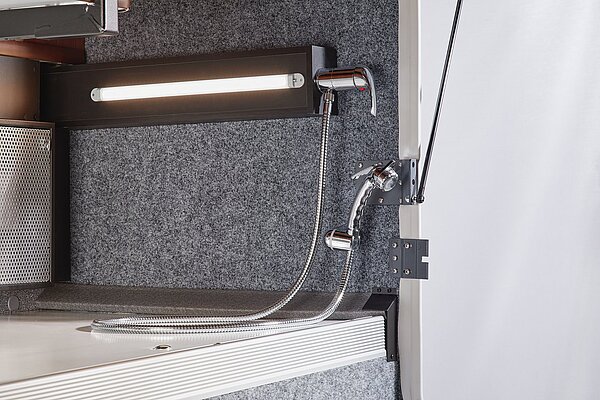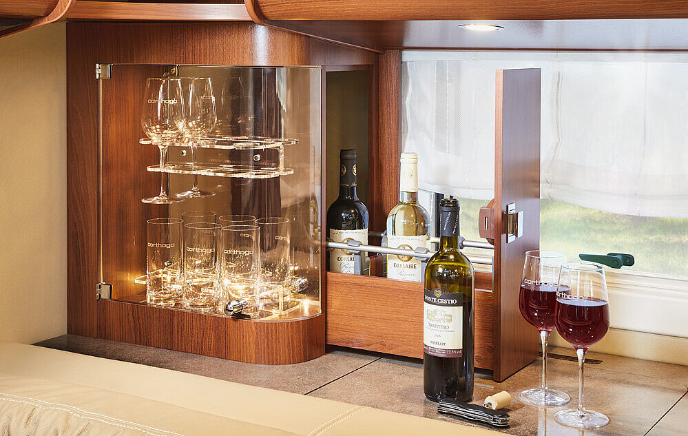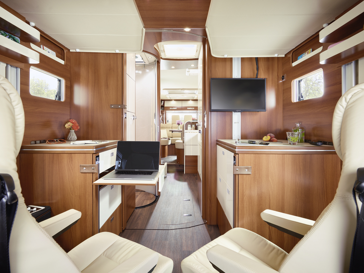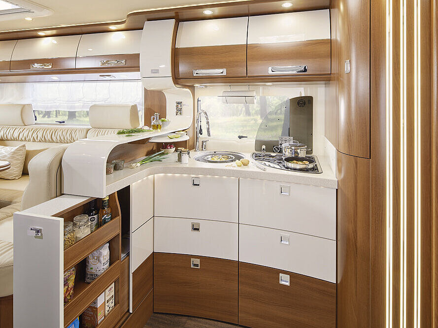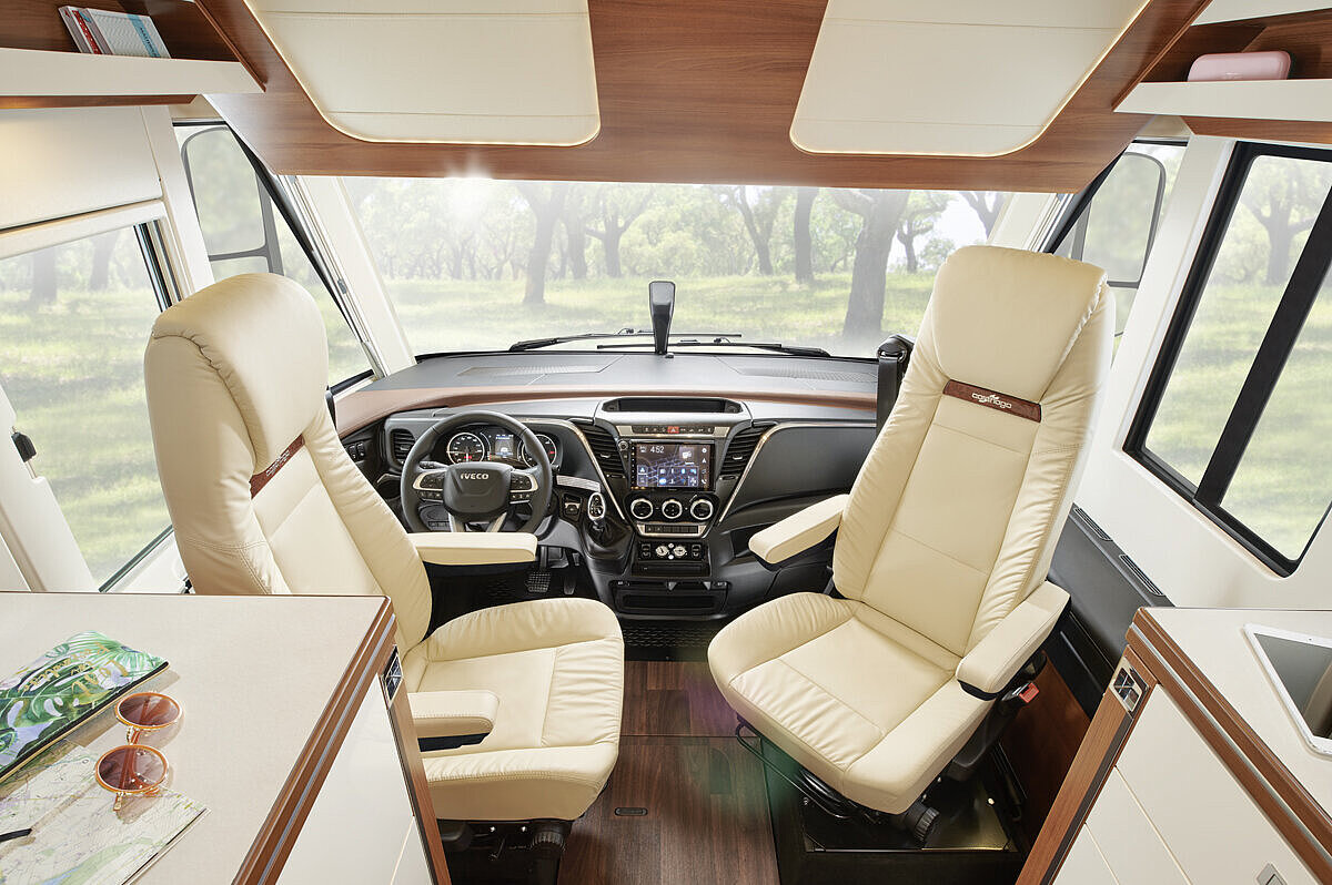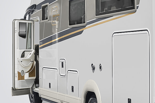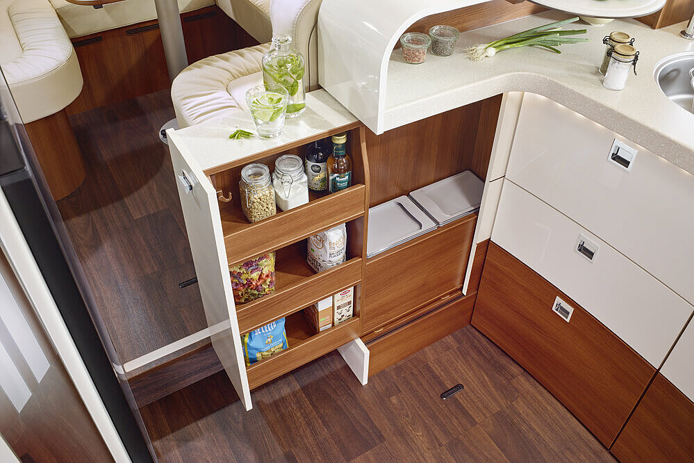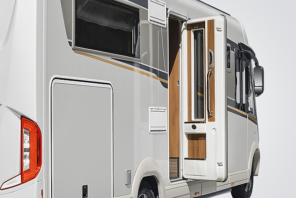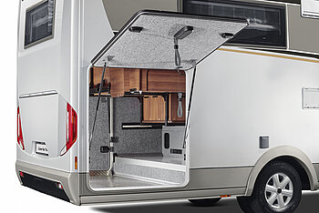 - Großer, zentraler Durchladeraum (Innenhöhe 36 cm/Fiat; 33 cm/Iveco), bequem beladbar auch durch die XL-Aufbautür über große, aufstellbare Wohnraumbodenklappe
