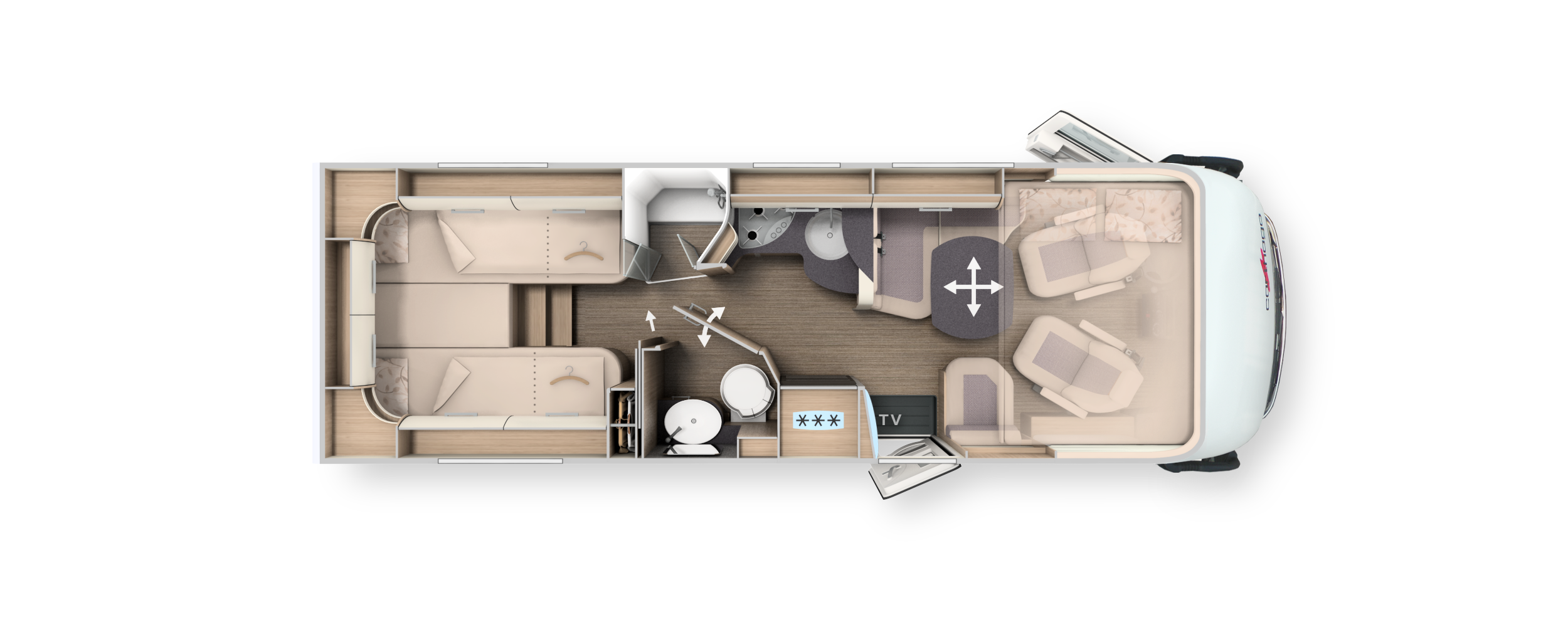 Il nuovo Carthago C2-tourer I si propone in otto diverse piante, tutte molto apprezzate. Tutte sono dotate di bagno spazioso, una cucina angolare con frigorifero separato e posizionato sul lato opposto del veicolo e un confortevole gruppo sedute a L con sedile laterale aggiuntivo. Naturalmente non può mancare il vano spogliatoio, tipico del marchio.