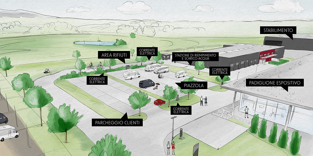 A due passi dall'elegante padiglione espositivo vetrato, siete arrivati alla destinazione dei vostri sogni. E la cosa migliore è che non manca nulla. Allacciamento elettrico e idrico, punti di smaltimento e tante attività tra cui visita guidata allo stabilimento, factory outlet, test drive e sentieri e piste ciclabili segnalati rendono quest'area di sosta un'autentica calamita per il pubblico.