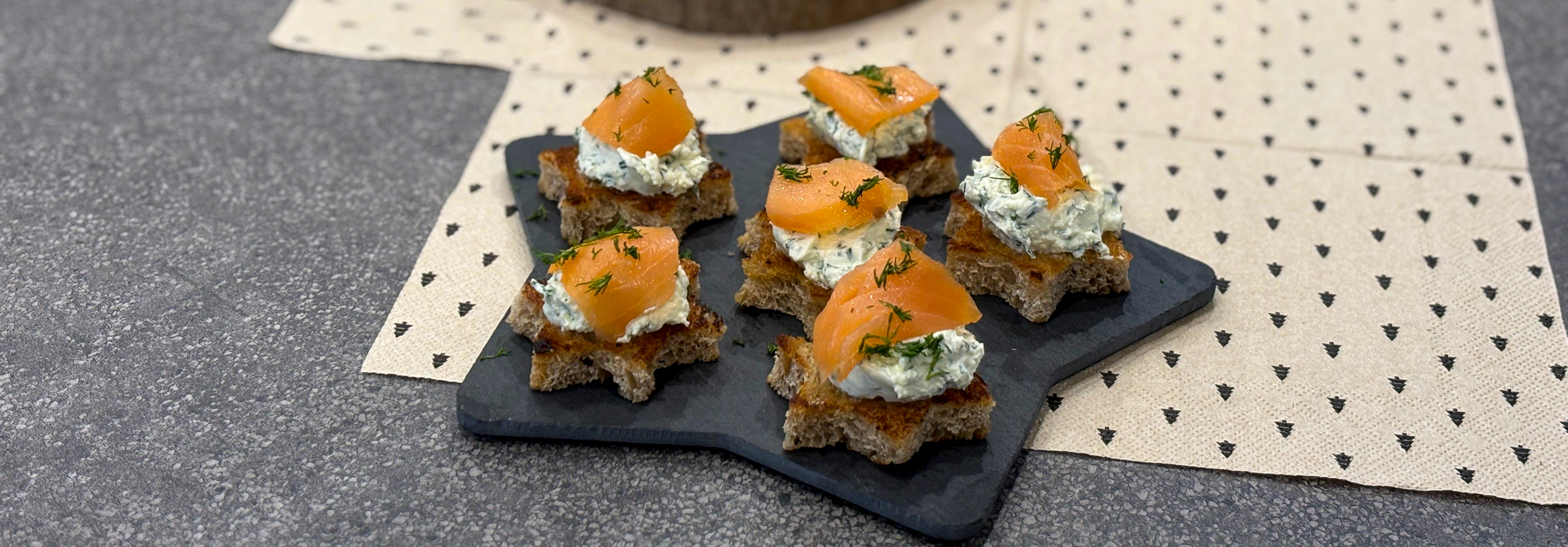 Fase 3: Tagliare le fette di salmone a pezzetti (circa un terzo), spalmare il formaggio cremoso sulle stelle e completare con un pezzo di salmone. Per finire, guarnire le tartine con un po' di aneto.