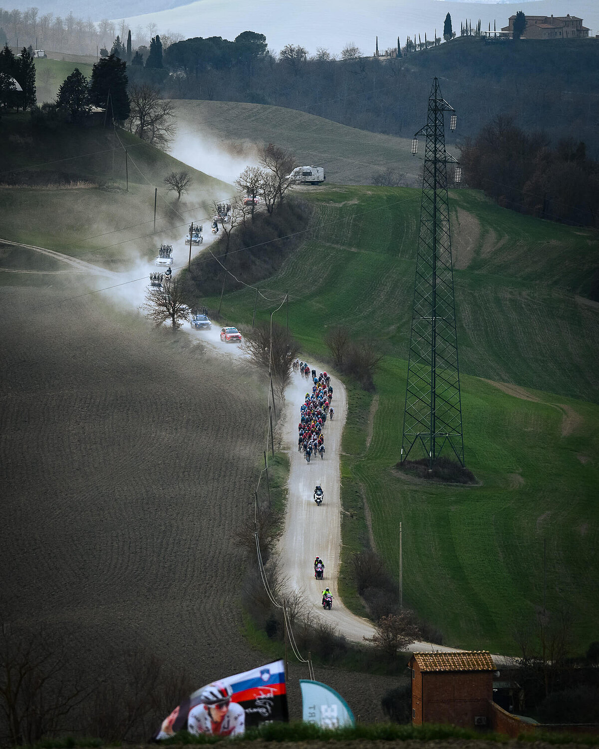 Auf dem 8. Schotterabschnitt des Monte Santa Maria zog das Tempo an der Spitze deutlich an. Alaphilippe versuchte zu beschleunigen, aber am Ende musste er nur auf eine Antwort des zweifachen Tour-de-France-Siegers warten. Pogačar beschleunigte stark, und als das Gelände in das Tal einbrach, setzte er sich mit hoher Geschwindigkeit von allen Verfolgern ab, die ihm nur einen Blick zuwarfen. Die atemberaubende Attacke 50 km vor dem Ziel überraschte alle Konkurrenten, denn noch nie hatte jemand den Sieg auf der Strade Bianche mit einer Ausreißergruppe mehr als 20 km vor dem Ziel gefeiert.