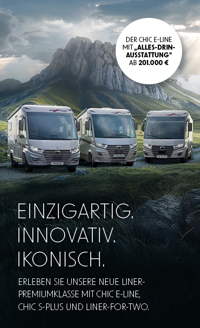 Der vollintegrierte chic e-line ist auf zwei unterschiedlichen Chassis erhältlich und bietet maximalen Wohnraumkomfort dank Two-level Raumkonzept und einer enormen Wohnraumhöhe. Zwei unterschiedliche Stilwelten, vier Grundrisse auf Mercedes-Benz, sechs auf Fiat Ducato, die Wahl zwischen Einzel- und Doppelachser sowie das optionale Autarkiepaket sorgen für höchste Individualisierungsmöglichkeiten.