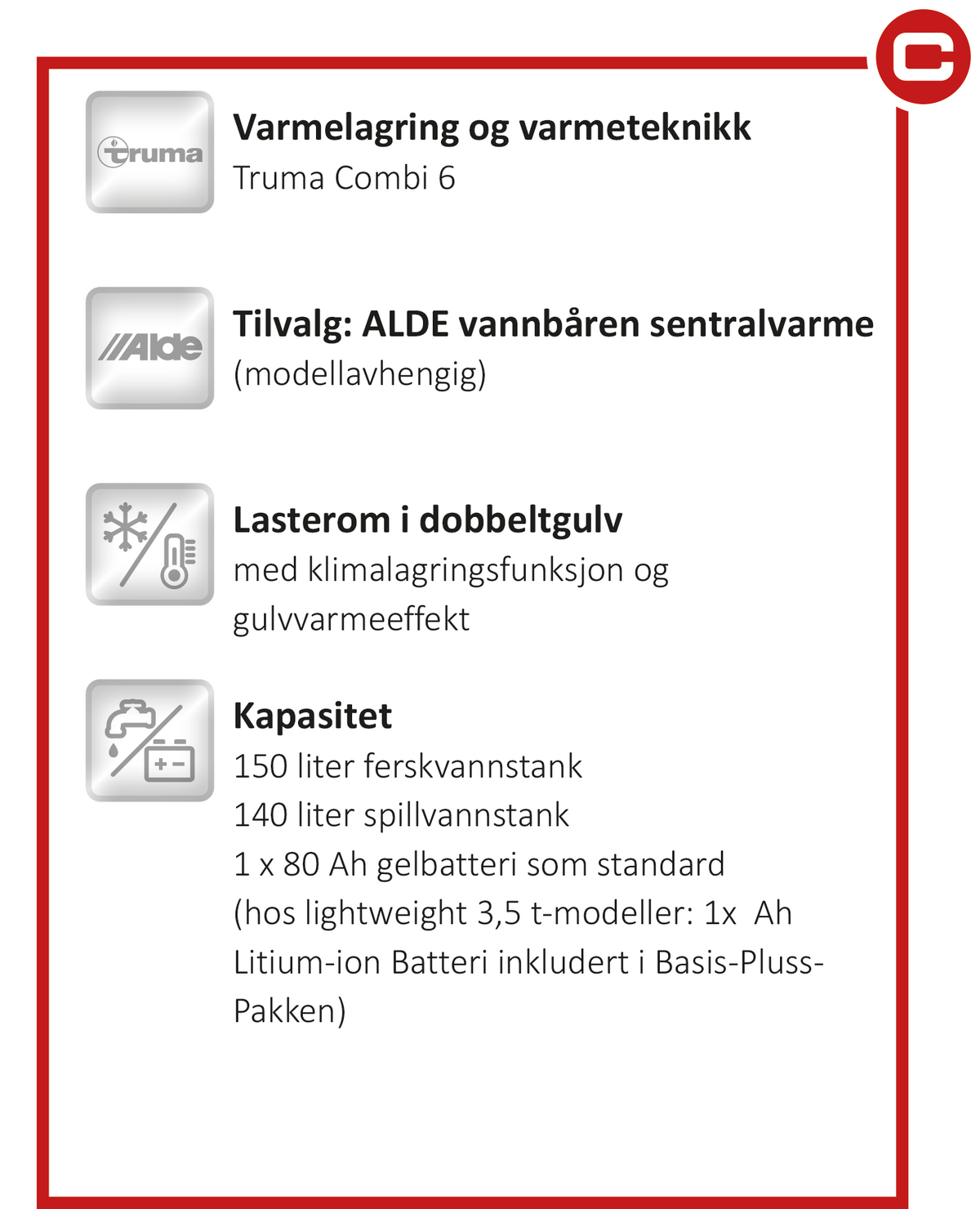 Vi har laget en liste over forskjellene i utstyrsnivået til lightweight 3,5 t- og comfort 4,2 t-modellene for å gjøre det enklere for deg å velge rett modell.