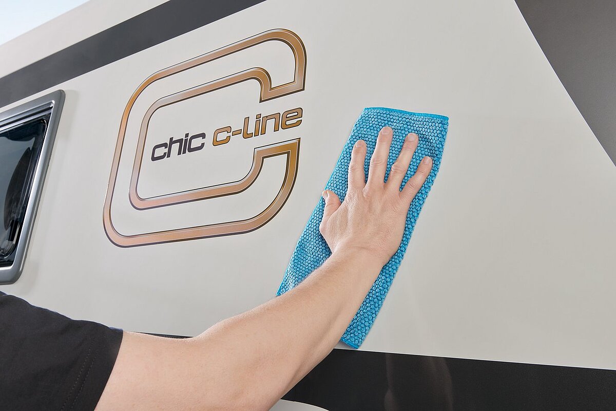 Särskilt taket på husbilen utsätts för mycket varierande väderlek. Genom flera rengöringsomgångar (från grov till mycket fin slippasta) går det att ta bort hård nedsmutsning. Löv eller snö ska tas bort från taket med jämna mellanrum.