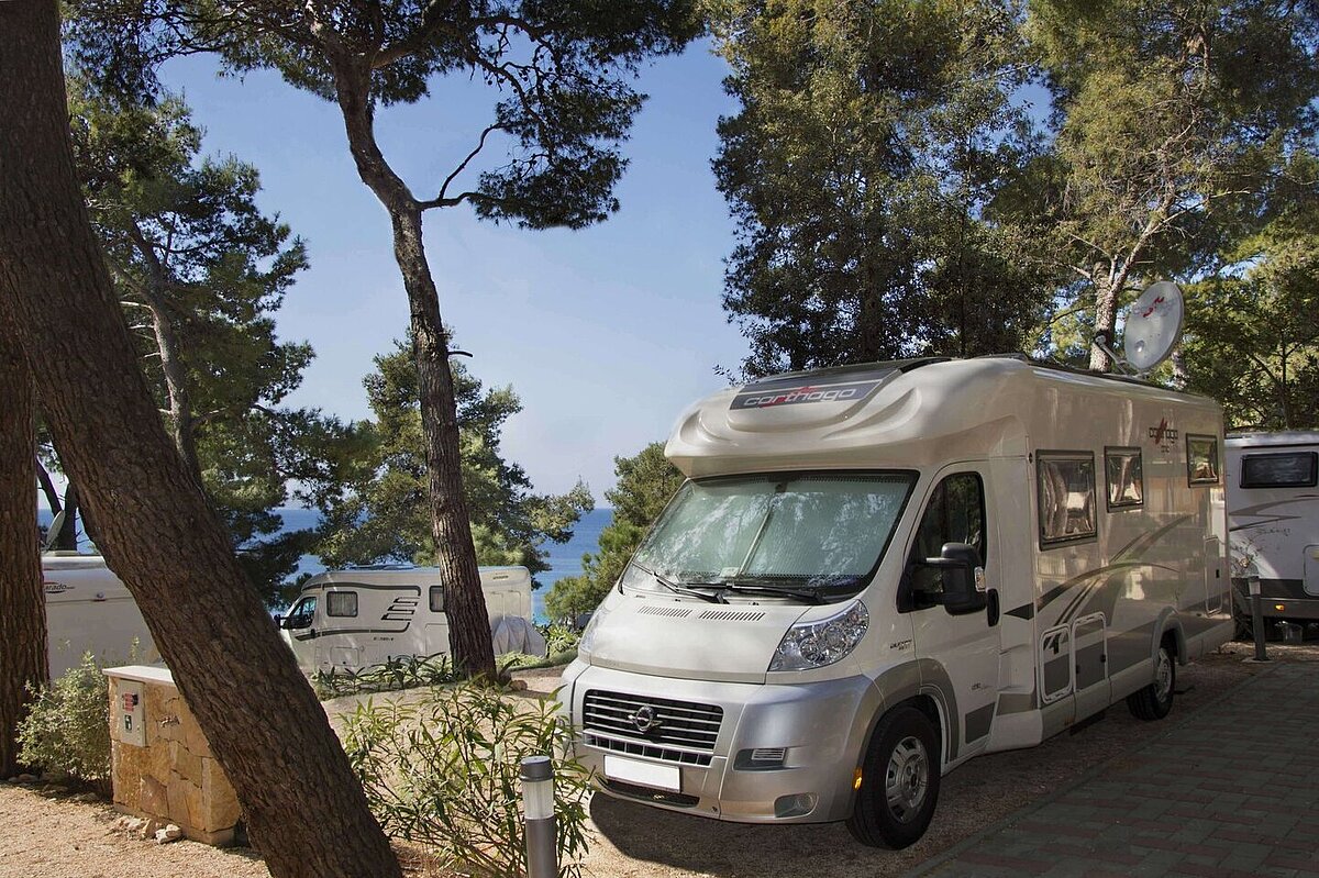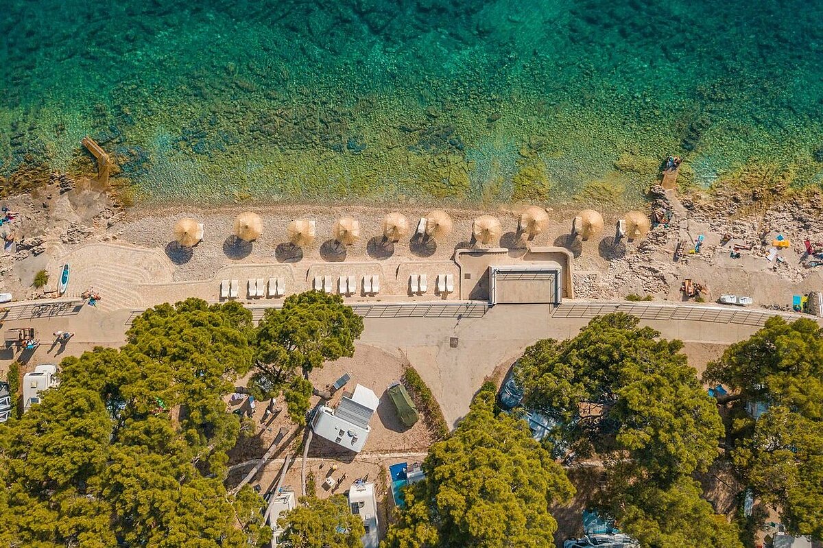Am südlichen Ende von Lošinj breitet sich in einem 130-jährigen Kiefernwald Camping Čikat aus. Über dieser Bucht mit dem kroatientypisch sehr langen, aber schmalen Fels- und Kiesstrand steigt der Campingplatz an einem steilen Hügel auf. So hat man von den allermeisten Stellplätzen etwas Meerblick – den tollsten zweifelsfrei von den bestens ausgestatteten Premium-Parzellen auf den unteren drei Terrassen. Hier befinden sich auch die Design-Mobilheime, die den Aufenthalt zum Glamping-Erlebnis machen. Das kleine, zum Camp gehörende Hotel Kredo in einer alten Villa setzt einen angenehmen baulichen Akzent. In vielerlei Hinsicht hält Camping Čikat eine Sonderstellung unter den Insel-Campingplätzen. Da wäre zuallererst der gigantische Aquapark, der mit seinen Rutschen und Wasserattraktionen vor allem Kinder und Jugendliche begeistert, in dem man aber auch ruhig sein Bahnen-Training absolvieren kann. In der Dachterrassen-Bar mit tollem Überblick wird bestes Eis serviert.