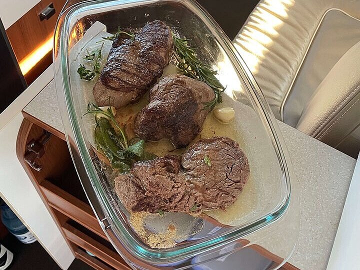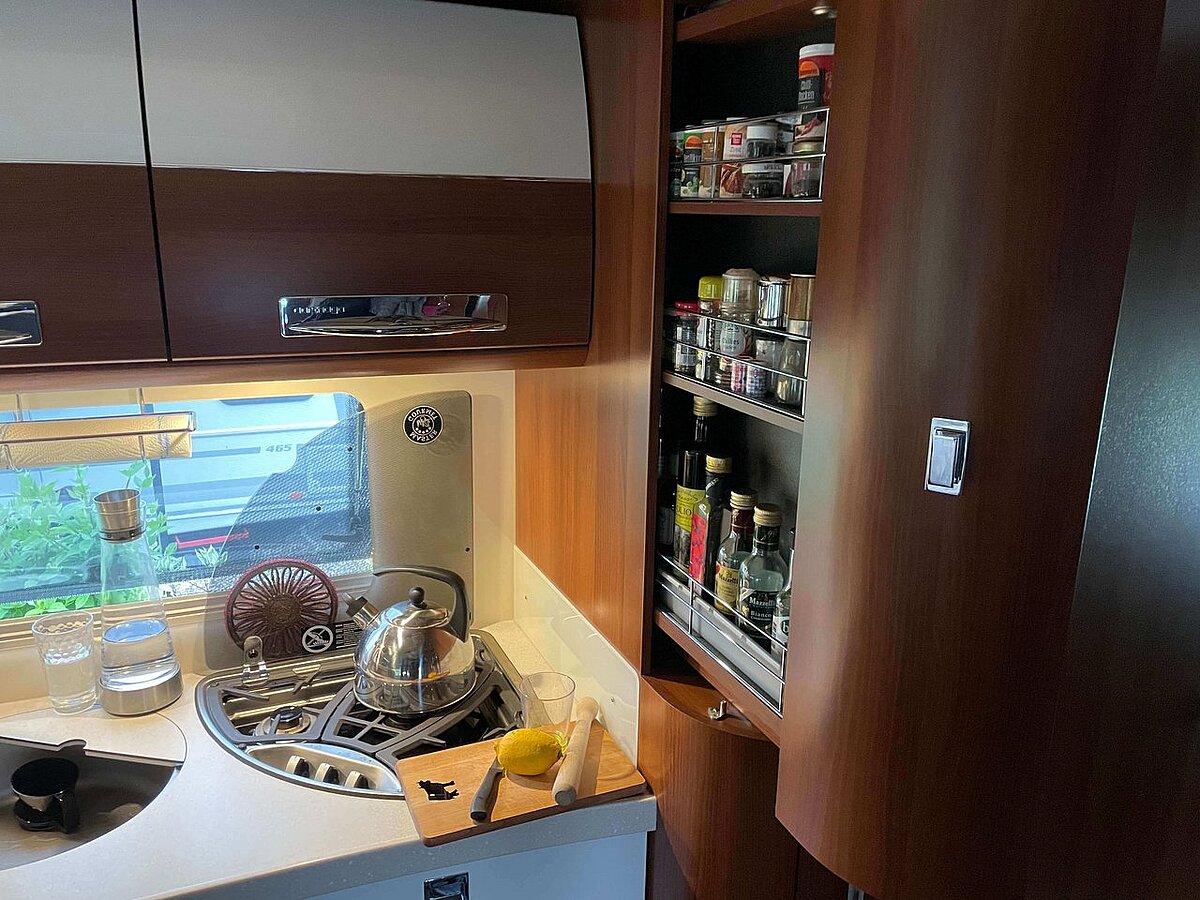 Dank des Apothekerauszugs sind Dinge wie Öl, Essig, Gewürze etc. immer griffbereit! Das nennt sich „barrierefreies Kochen“. Durch die großartige Beleuchtung in der Küche entgeht einem nichts und man hat alles im Blick. Wir haben keine Einschränkungen beim Kochen, das Erlebnis ist wie Zuhause in der Küche. Gerade mit der Kombination mit dem Backofen (den wir sehr empfehlen und nicht mehr missen wollen) gelingt jedes Steak auf den Punkt. Als nächstes möchten wir gerne einen Kuchen im Reisemobil backen, wir sind schon ganz gespannt auf das Ergebnis.
