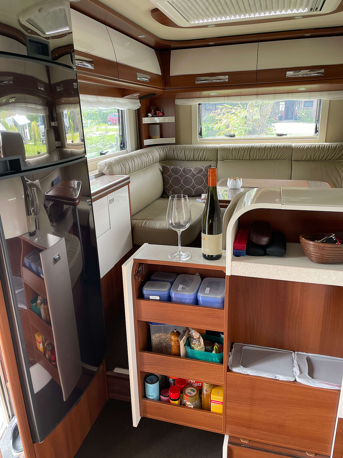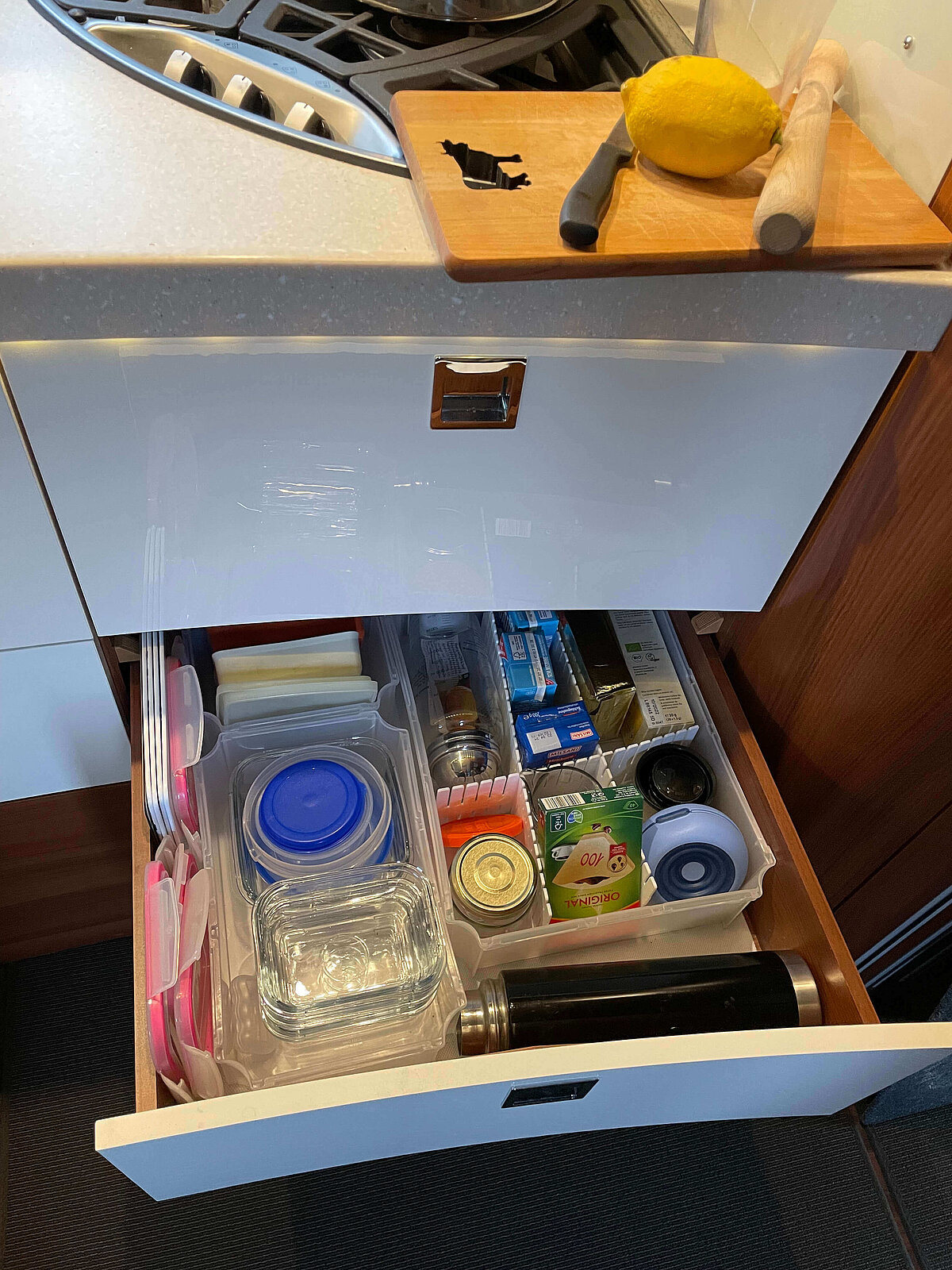 Der ausziehbare Wasserhahn ist durchdacht: Man kommt mit ihm in jede Ecke und auch der Wassertank der versenkbaren Kaffeemaschine kann damit befüllt werden. Stauraum ist mehr als genug vorhanden, selbst unsere Salatschleuder reist mit. Auch große Utensilien finden ihren Platz im Stauraum. Uns haben Abtrennungen bei den Schubladen etwas gefehlt, so haben wir uns jedoch selbst geholfen und etwas gebastelt. Auch für die Weingläser haben wir eine super Idee gehabt, wie diese sicher verstaut werden können und sofort umgesetzt.