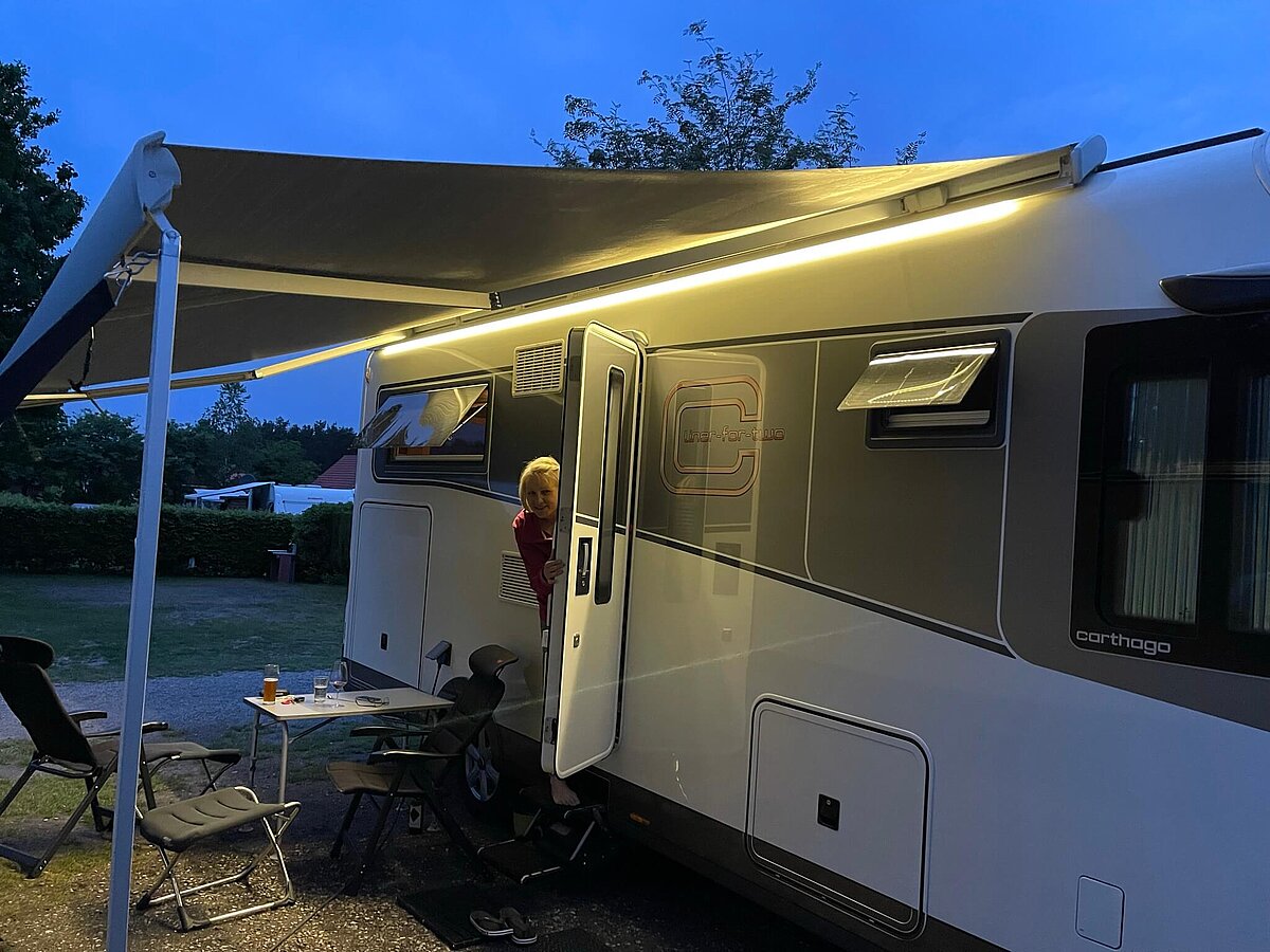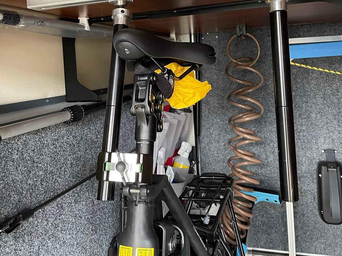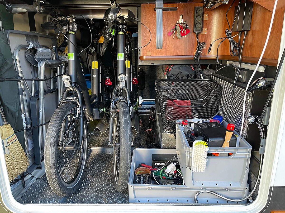 Mit der Pedelec-Rollergarage konnten wir unsere Fahrräder richtig gut sichern und transportieren. Dank der Mulde für die Vorderreifen ist es völlig ausreichend, wenn nur die Hinterräder in einer Bodenschiene stehen. Erwähnenswert ist auch der Halter für Tisch, Stühle und Fußauflagen, das System haben wir für den liner-for-two etwas gekürzt und nutzen es somit bereits im dritten Fahrzeug. Ich kann nur sagen: Platz ohne Ende, wir könnten noch mehr mitnehmen, aber mehr wird nicht benötigt. Die Roller haben wir ja im Anhänger.