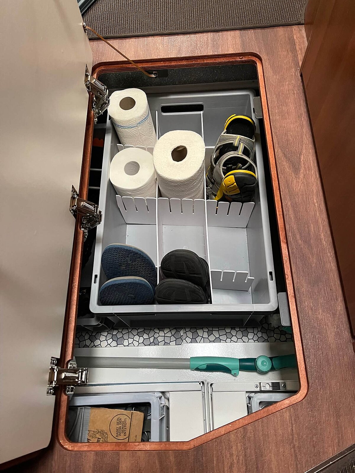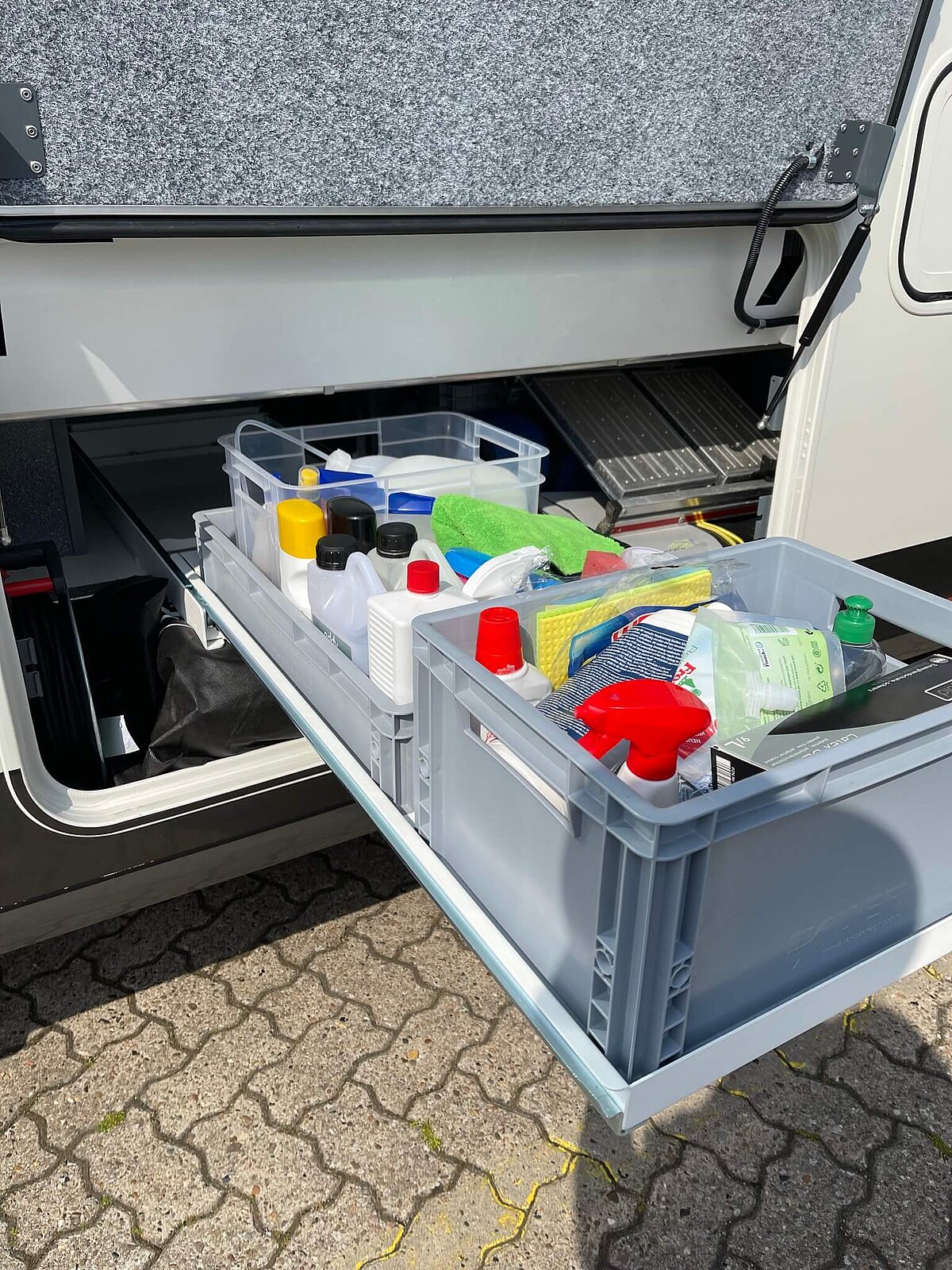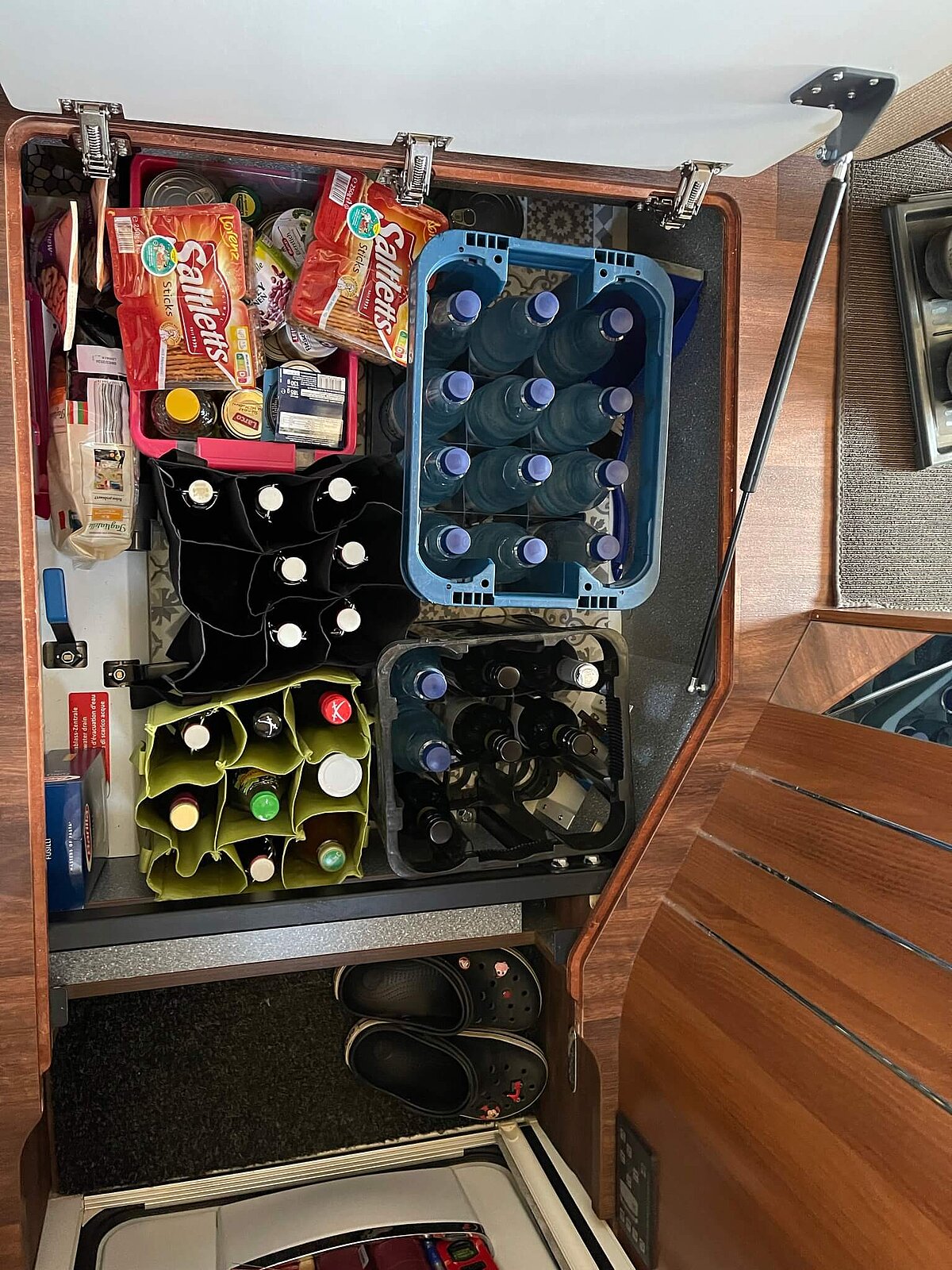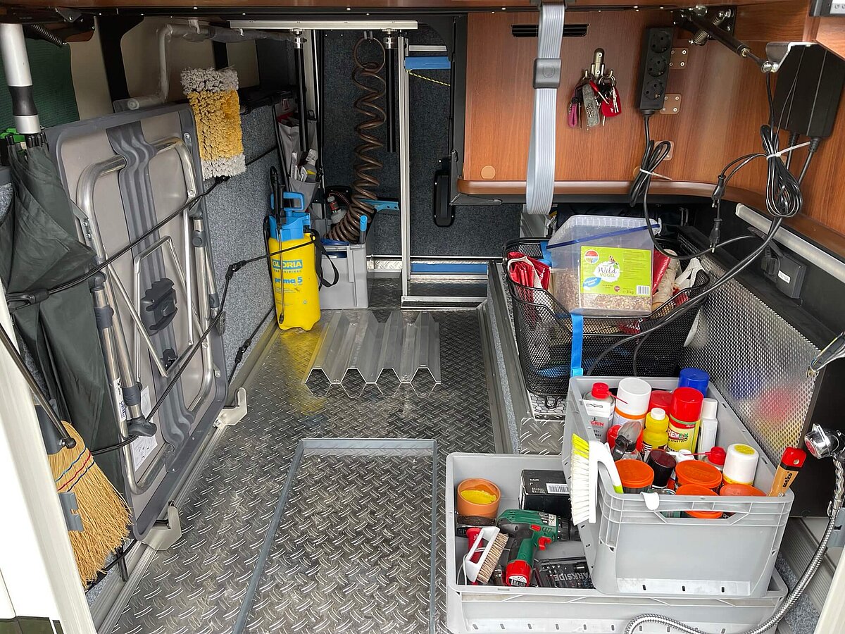 Auch im Reisemobil selbst gibt es so viele Fächer vom Doppelbodenkeller, dass wir wirklich genug Platz haben für alle Utensilien, Getränke, Lebensmittel und unser Reisegepäck. Wir hätten nicht geglaubt, dass wir so viele Getränkekisten unterbekommen, aber der Doppelbodenkeller ist so tief, dass selbst das möglich ist