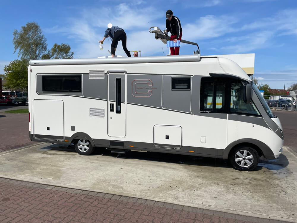 Für das Dach werden einmal im Jahr die Kinder eingespannt, da sie leicht sind und mit passenden Unterlagen unter den Knien bekommt man das GFK Dach sehr schnell wieder blitzblank. Die großen Scheiben werden dann noch im Nachgang mit Acrylpflege blank poliert. Das ist alles recht einfach, weil das Fahrzeug durch seine Bauform und der innenliegenden Scharniere an den Klappen nicht so viele Winkelecken und so weiter hat.