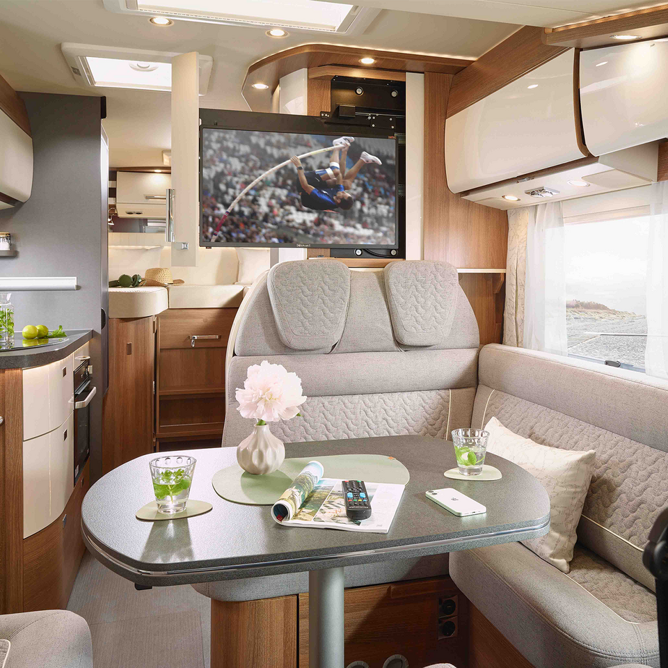 Bei den vollintegrierten Wohnmobilen der Baureihe C2-tourer ist höchster Wohnkomfort serienmäßig mit an Bord. Was uns da so sicher macht? Unsere hochwertige Möbelarchitektur, die modernen Stilwelten, die L-Wohnsitzgruppe mit ergonomisch