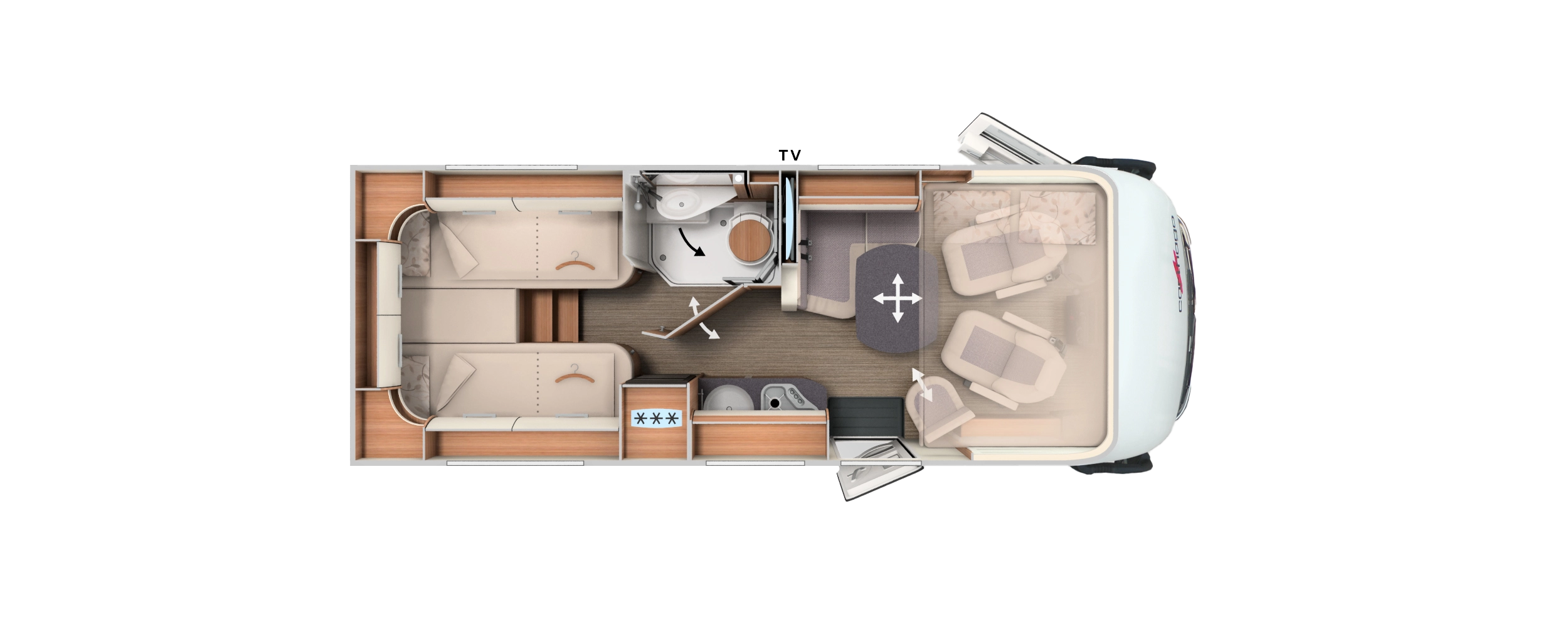 - + Komfortabler Innenzugang über Sitzbankdeckel der L-Wohnsitzgruppe, aufklappbare Seitensitzbank sowie große Wohnraumbodenklappen